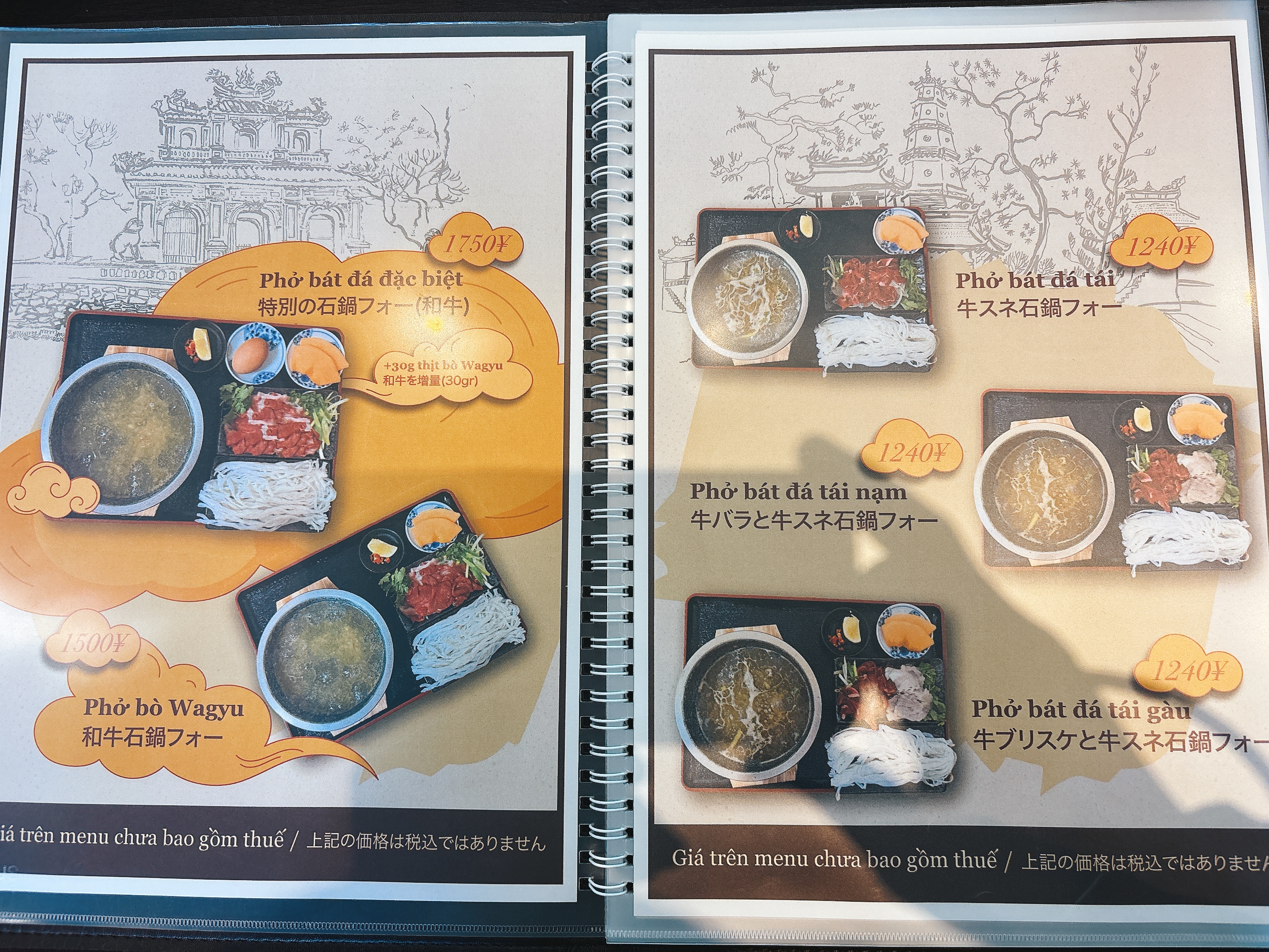 牛バラと牛スネ石鍋フォーを注文し、卓上調味料やメニューをチェックして待ちます。