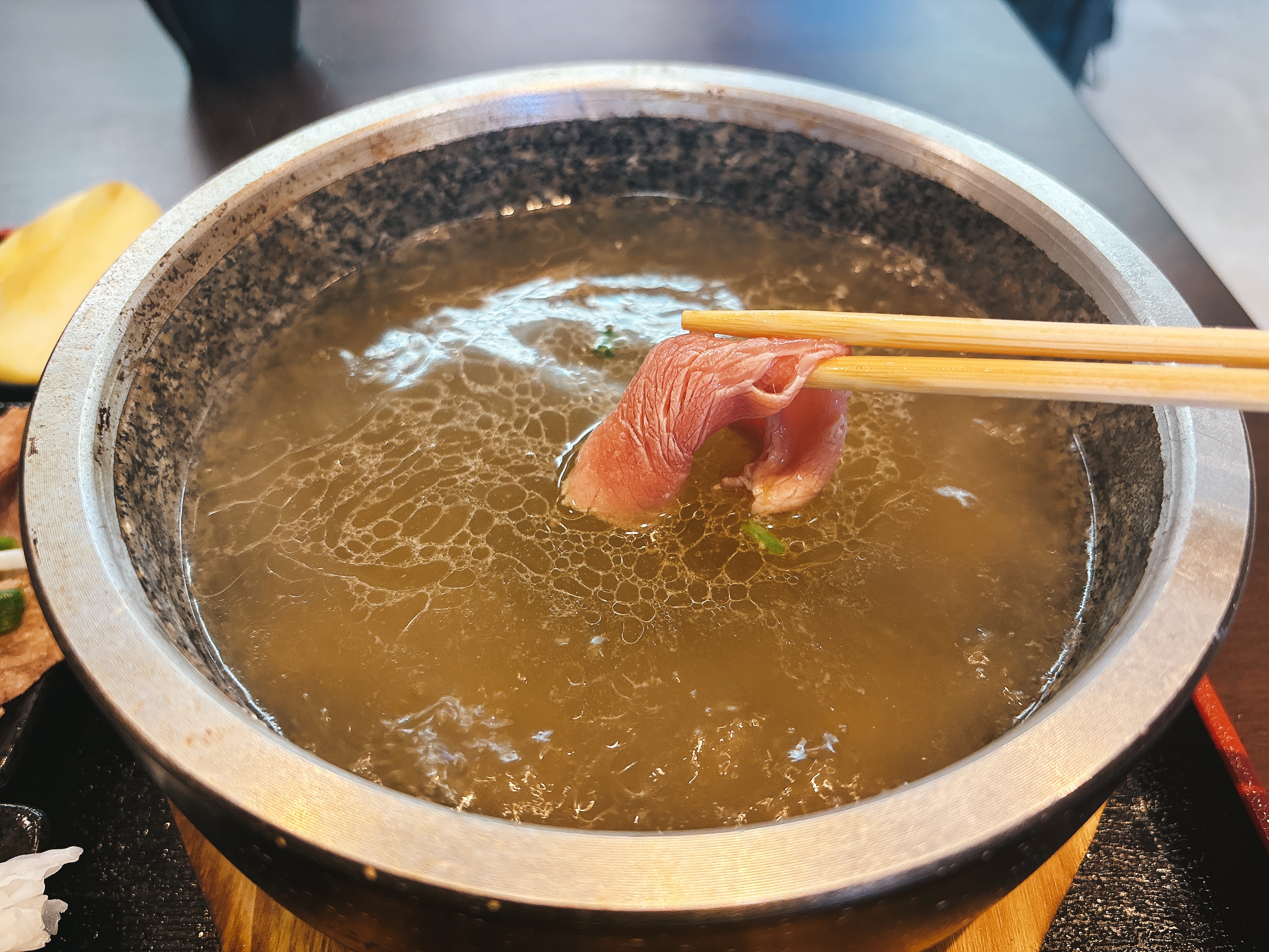 石鍋の物珍しさ・自分でしゃぶしゃぶする楽しさが印象に残りました。