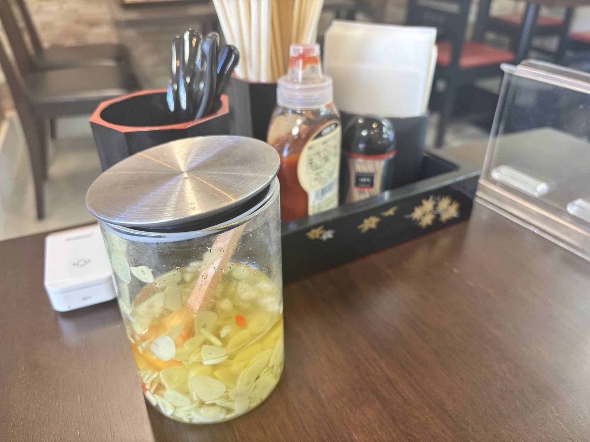 酢漬けニンニク、チリソースが置いてありました。
