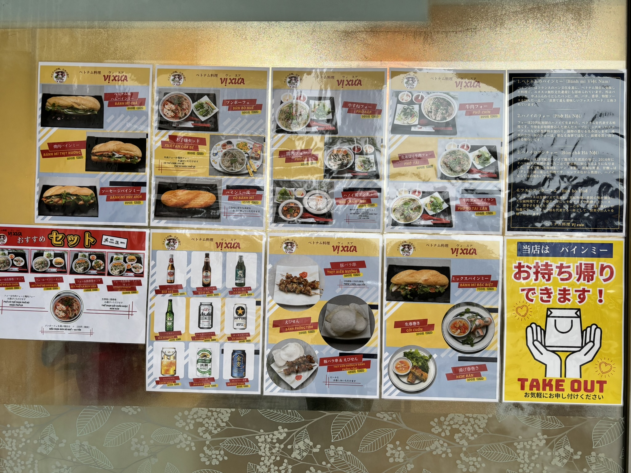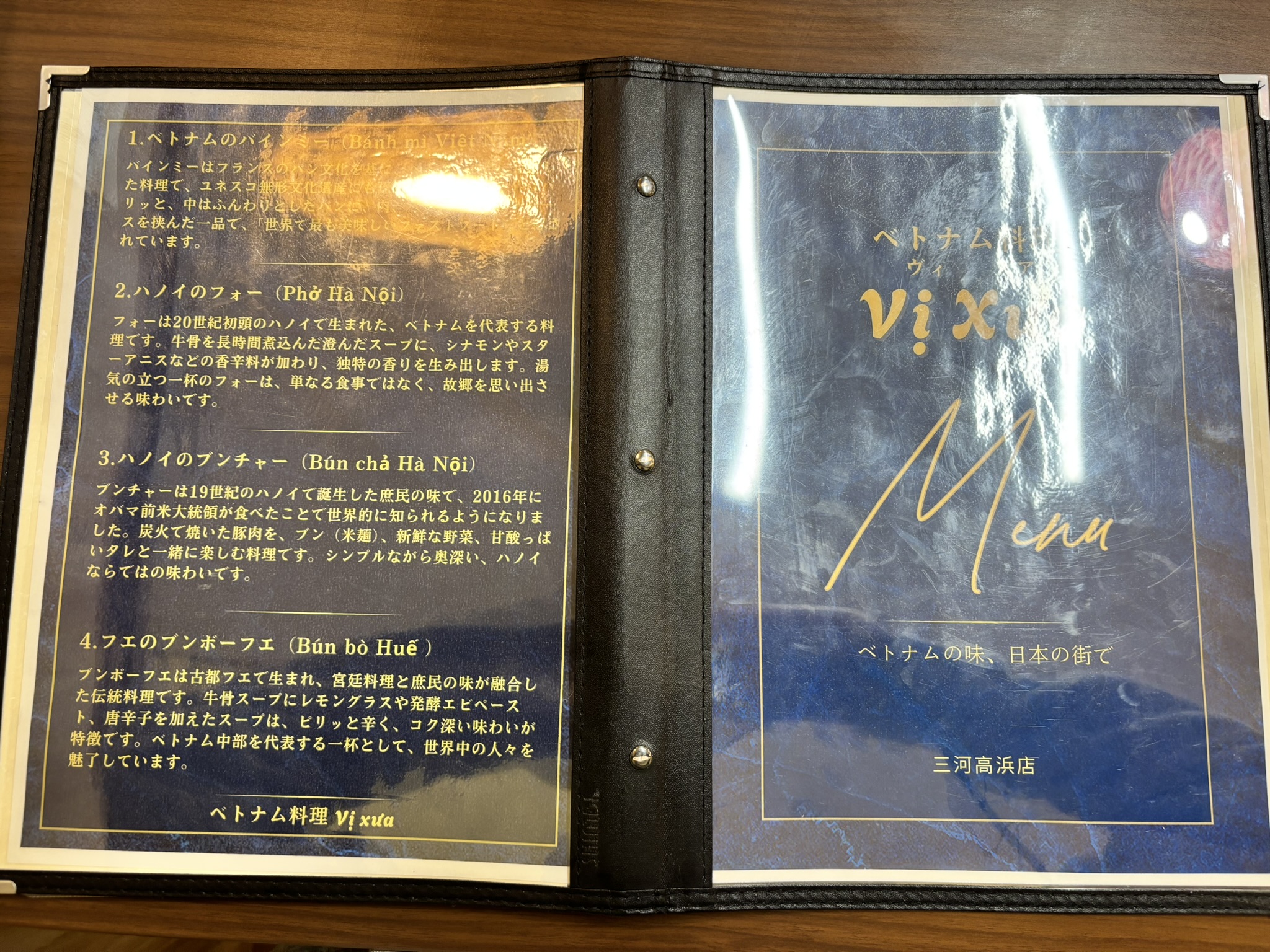 メニューには、ベトナムの代表的な料理「バインミー」「フォー」「ブンチャー」「ブンボーフエ」の説明が書かれていました。